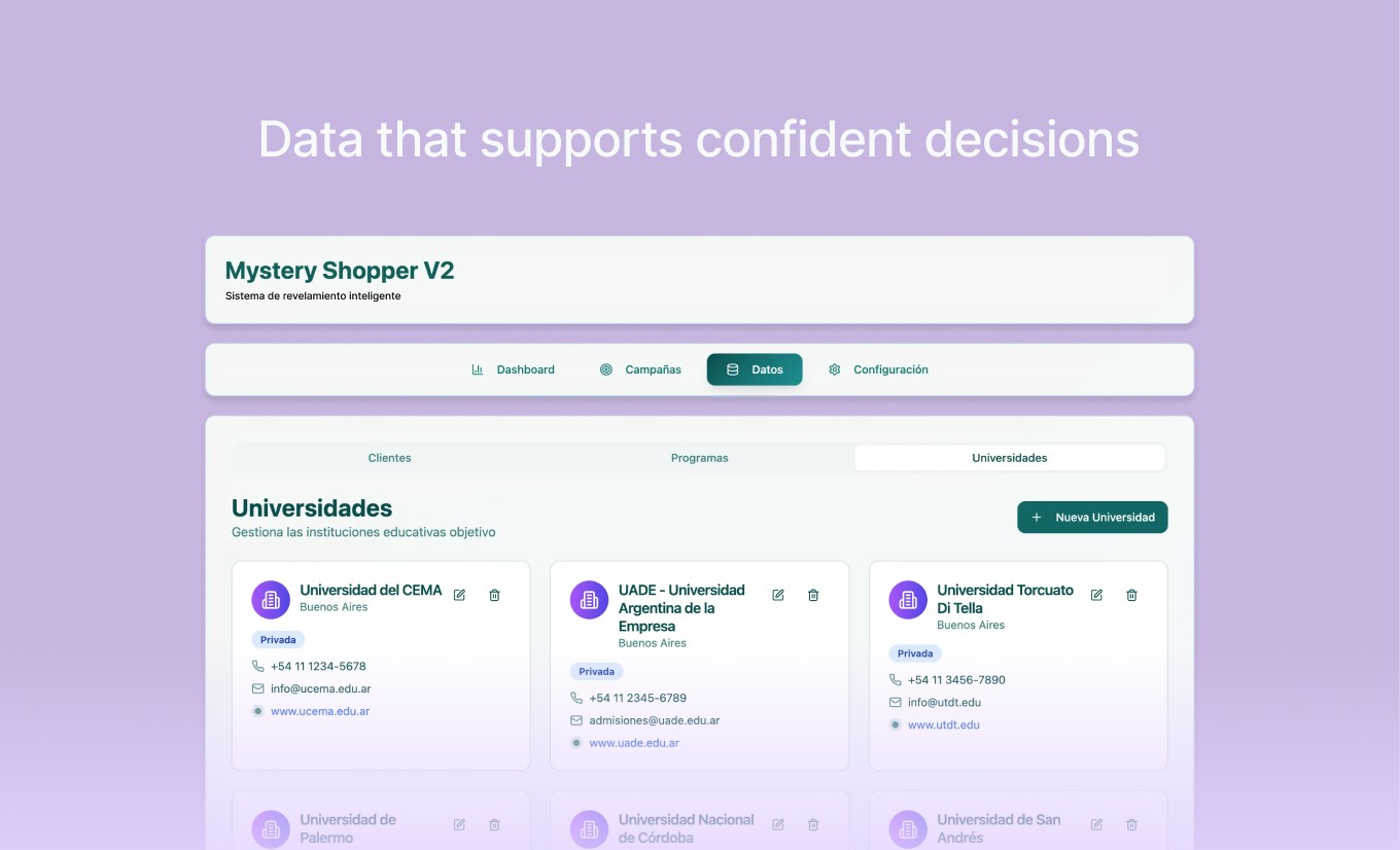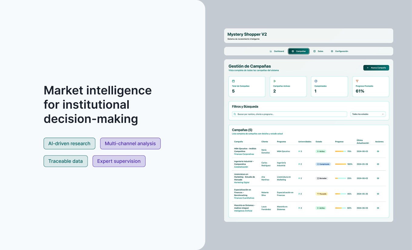 Diseñamos una plataforma web de Mystery Shopper inteligente, pensada específicamente para el ecosistema de educación superior.